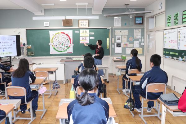 「バランスのよい食事」をテーマに1年生の家庭科で講師を招き授業を行いました。講師には、深川市立一已小学校 狩野香織 栄養教諭を迎えました。