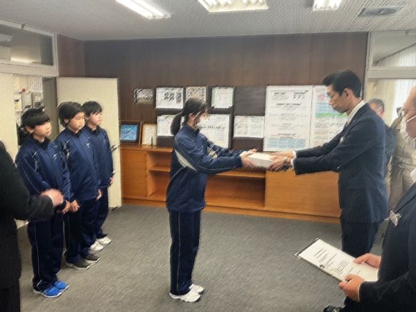 12月3日(水)に、校長室にて授賞式が行われました。北口副町長から賞状と受賞記念品が授与されました。