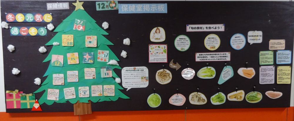 (保健室前の掲示板—アドベントカレンダー風に冬を元気に過ごすポイントが紹介されています!)