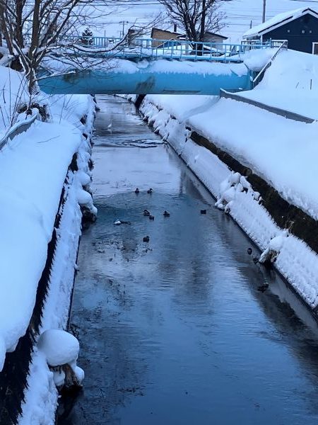 昨朝の学校前の温度計が-19℃を指していました。今朝では、妹背牛中学校橋のふもとで鳥が羽を休めていました。「こんなに寒いのに、鳥には水は冷たくないのかな」など思ってしまいます。