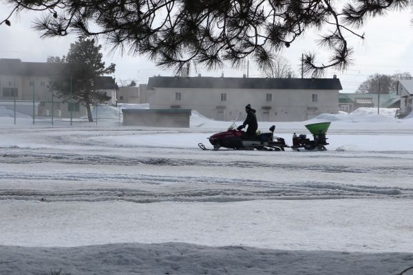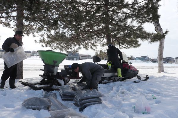 雪に覆われたグラウンドに、伊藤達矢様、石田和利様、神藤武志様が、ボランティアで融雪剤の散布をしていただきました。