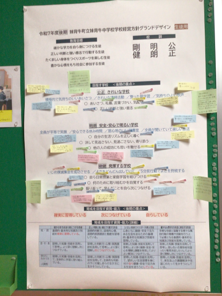 令和8年度の「妹背牛中学校学校経営方針グランドデザイン」をもとにして、「自分の目指すこととぴったりだ!」「これをみんなで取り組もう!」を取り掛かりに、生徒会執行部と校長とで意見交換をしました。