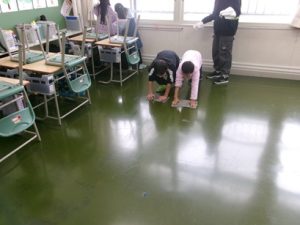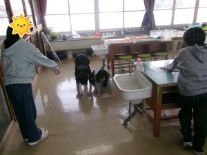 ↓ 高学年の指示のもと床をふきます ↓