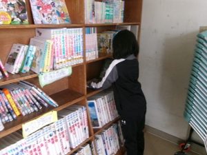 ↓ 図書室の本棚をふきます          ↓ トイレの床ふき