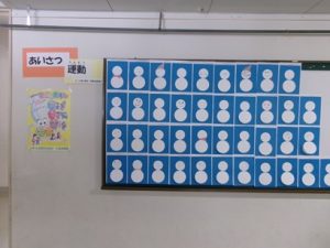 児童会書記局による「スマイルとあいさつ運動」が2月6日(金)までの日程で始まっています。学校生活の中で「うれしかった」ことや「ありがとう」と感じたことがあれば、雪だるまのお腹に書いて貼り出します。さらに、あいさつができたら、その雪だるまに手袋などを貼っていきます。たくさんの思いが集まり、完成した雪だるまがたくさんできることを楽しみにしています。
