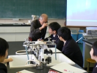 【理科総合B】 ○光(物質ではないが確かに存在するもの) ・紫外線の確認:ブラックライトを利用した比較 (紙、布、蛍光物質などの反応比較) ・赤外線の確認:放射温度計を用いた実験 ・可視光の確認:スペクトルスコープによる観察 原子が作る光(炎色反応、ナトリウムランプ) 熱を持つ物質が出す光(太陽光、白熱電球) 色の存在を確認(ナトリウムランプのみの光の中で実験) ○慣性(物質とは慣性があるもの) ・ボールペンを紙の上に立て、倒さずに紙を抜き取るためにはどうしたらよいか。 ・瓶の上に刺繍用のリングを置き、その上に乾電池を置く。 リングを素早く抜き取ると乾電池はどうなるか。 【生物T】 ○生物の不思議な秘密を顕微鏡で観察 ・服につく種子(アメリカセンダングサ、キンミズヒキ など計4種) ○生物の誕生を考える。 ・ビデオ鑑賞(テレビ録画内容) |